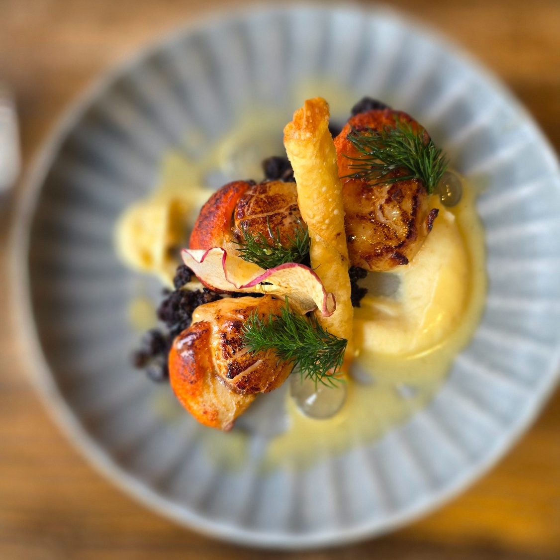 We work closely with local fishermen, growers, and small producers, building menus around what the Island gives us seasonally. Our seafood dishes are rooted in the harbour outside our door: queenies landed metres away, day‑boat catch from skippers we know by name, and produce from farms we’ve partnered with for years.